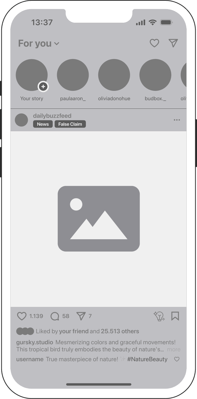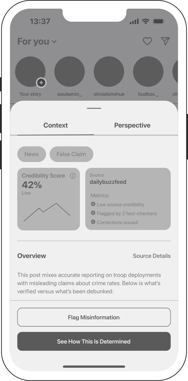 Every intervention mimics Instagram’s native patterns: bottom sheets, swipeable tabs, pill labels, and card behaviours. This ensures new credibility tools feel instantly intuitive, reducing friction and boosting adoption.
