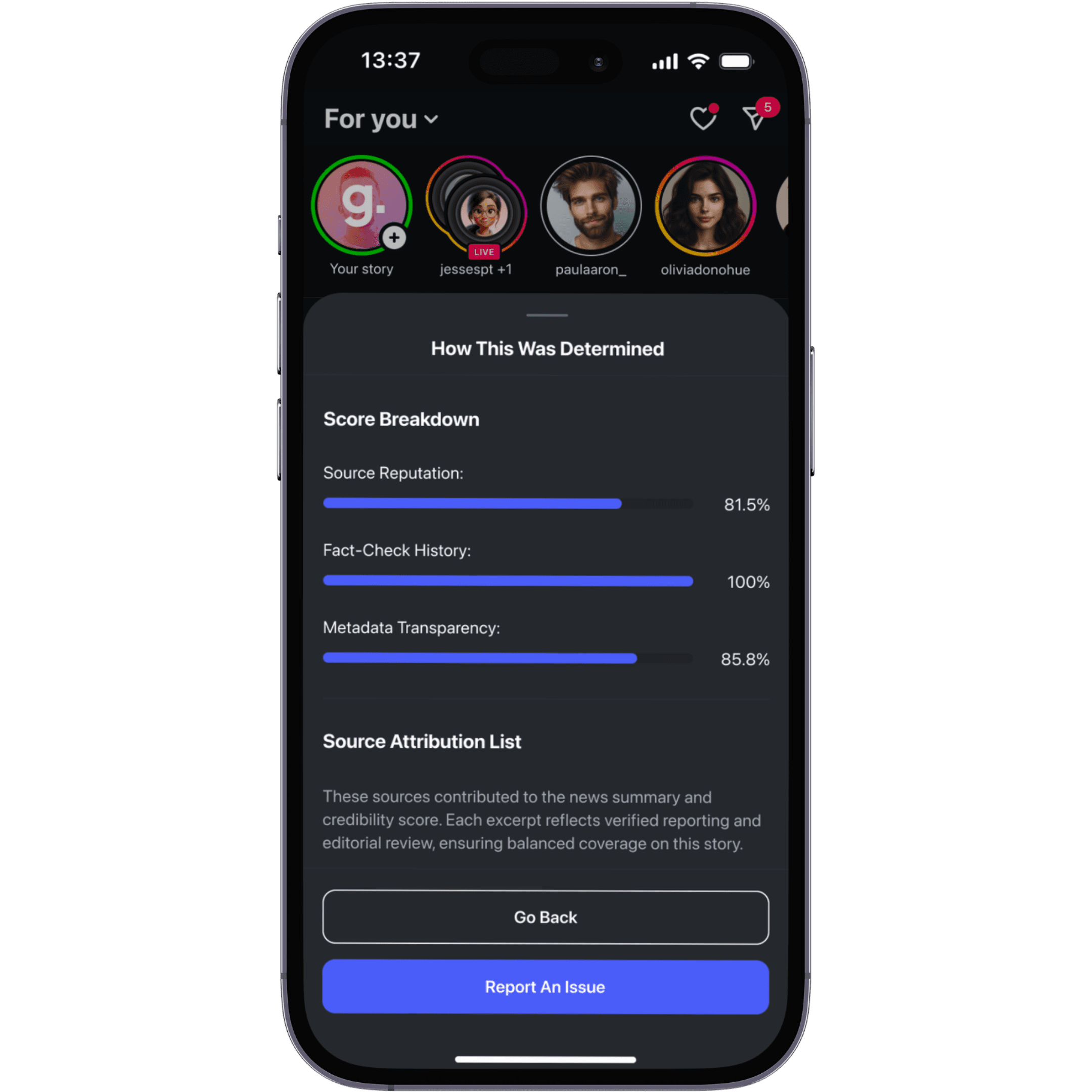 A clear breakdown of how the credibility score was calculated — reputation, fact-check history, metadata transparency, and corrections — all presented visually.