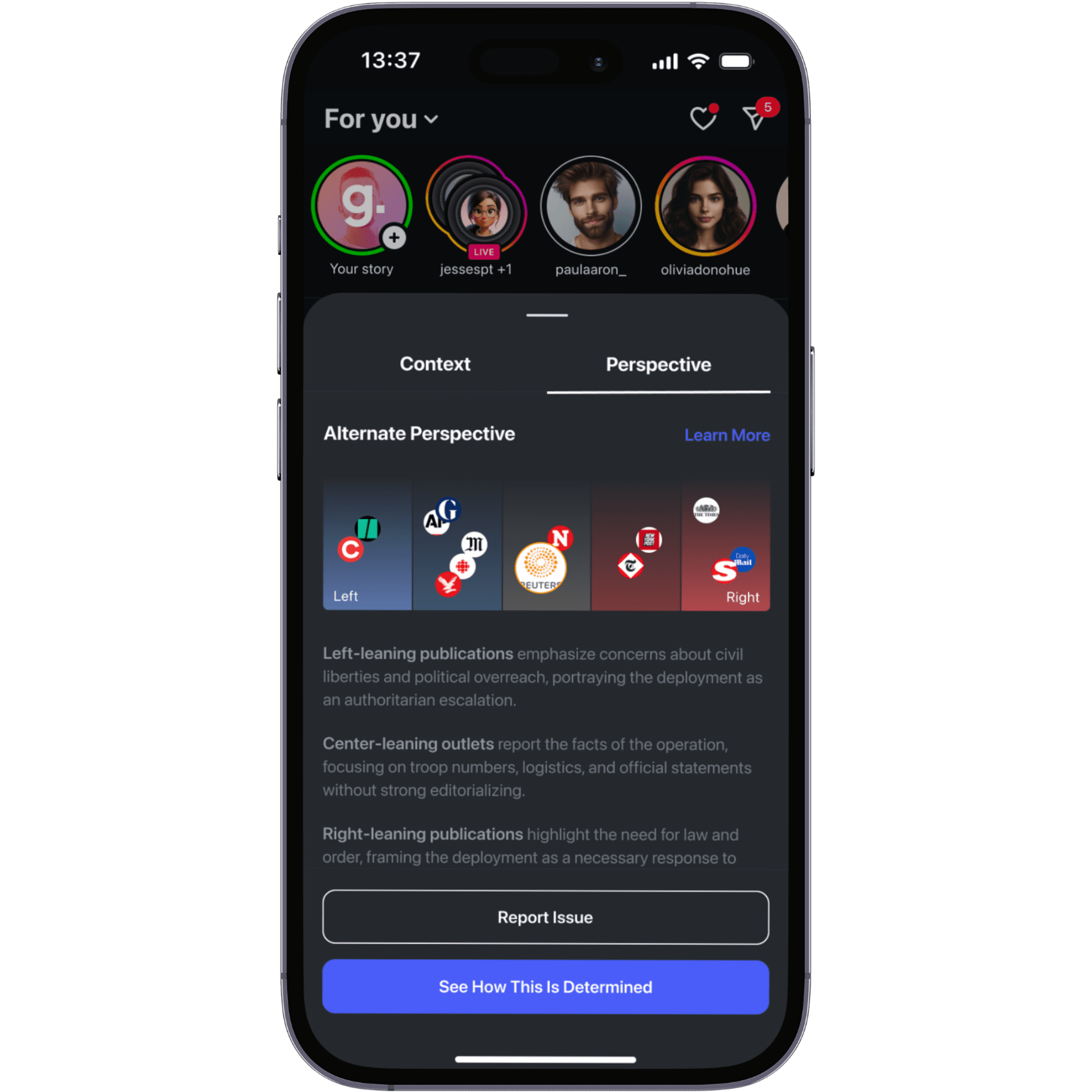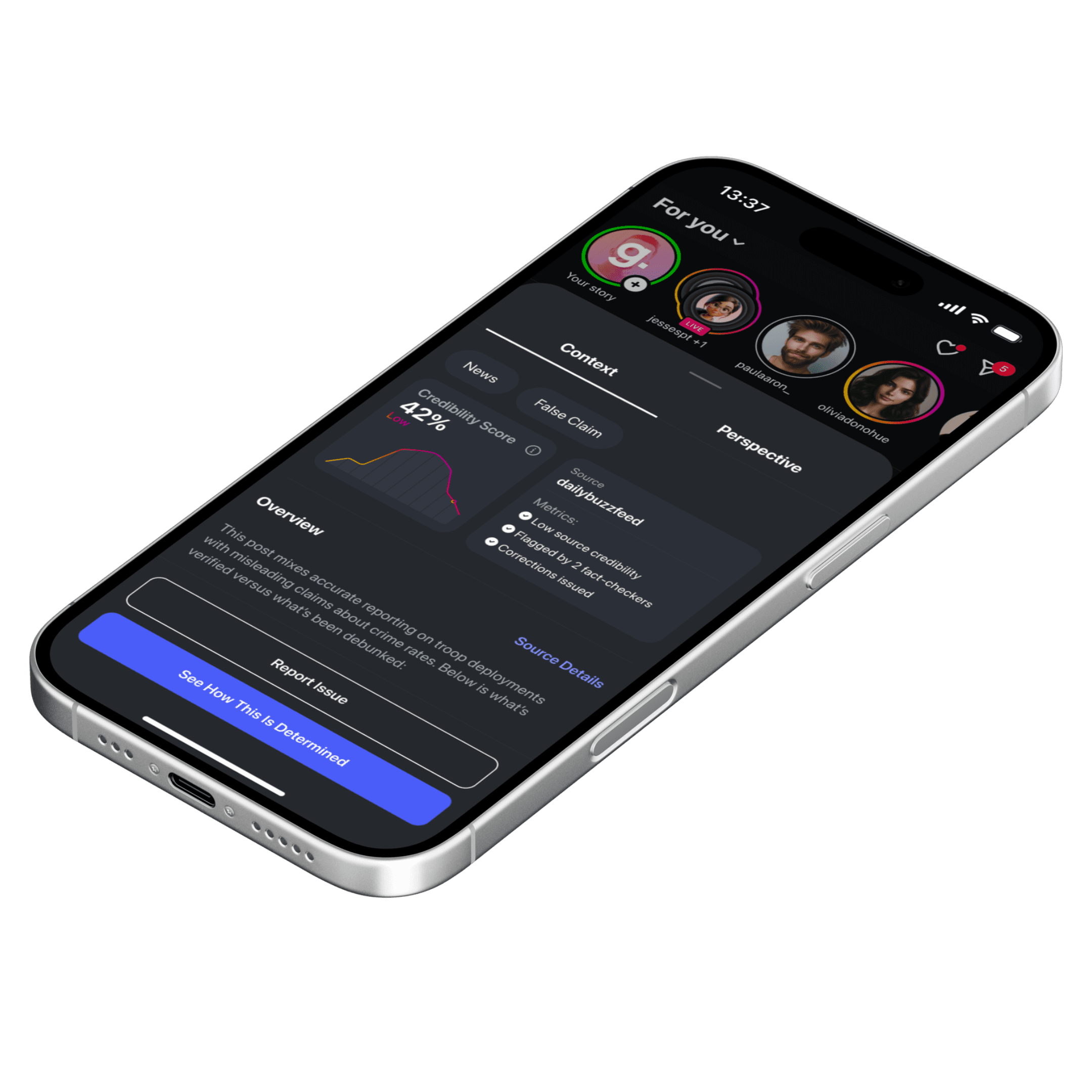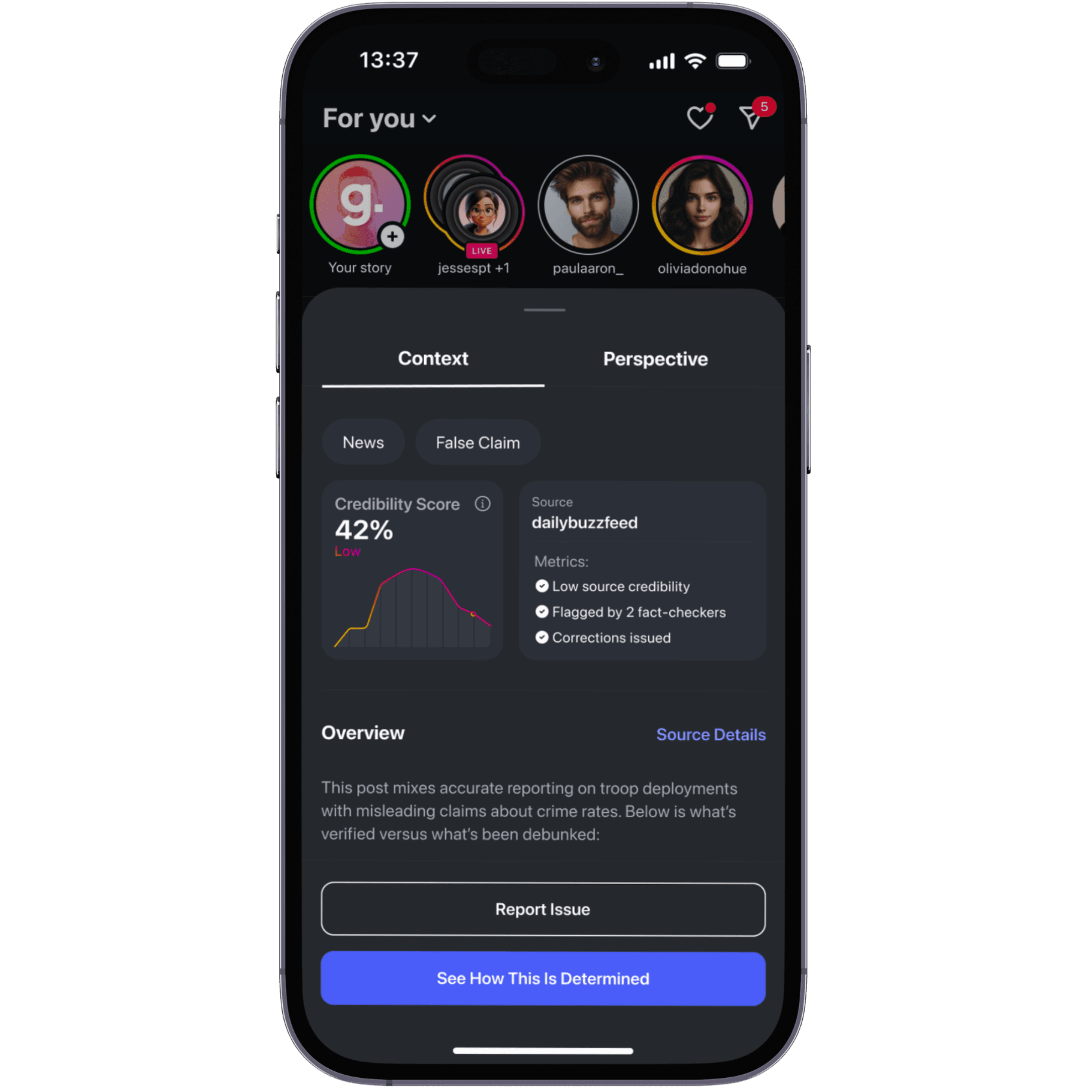 Context without breaking the scroll. When a post might trigger emotional reactions or spread quickly, users can tap for a deeper layer — showing timelines, key facts, and multiple viewpoints.
