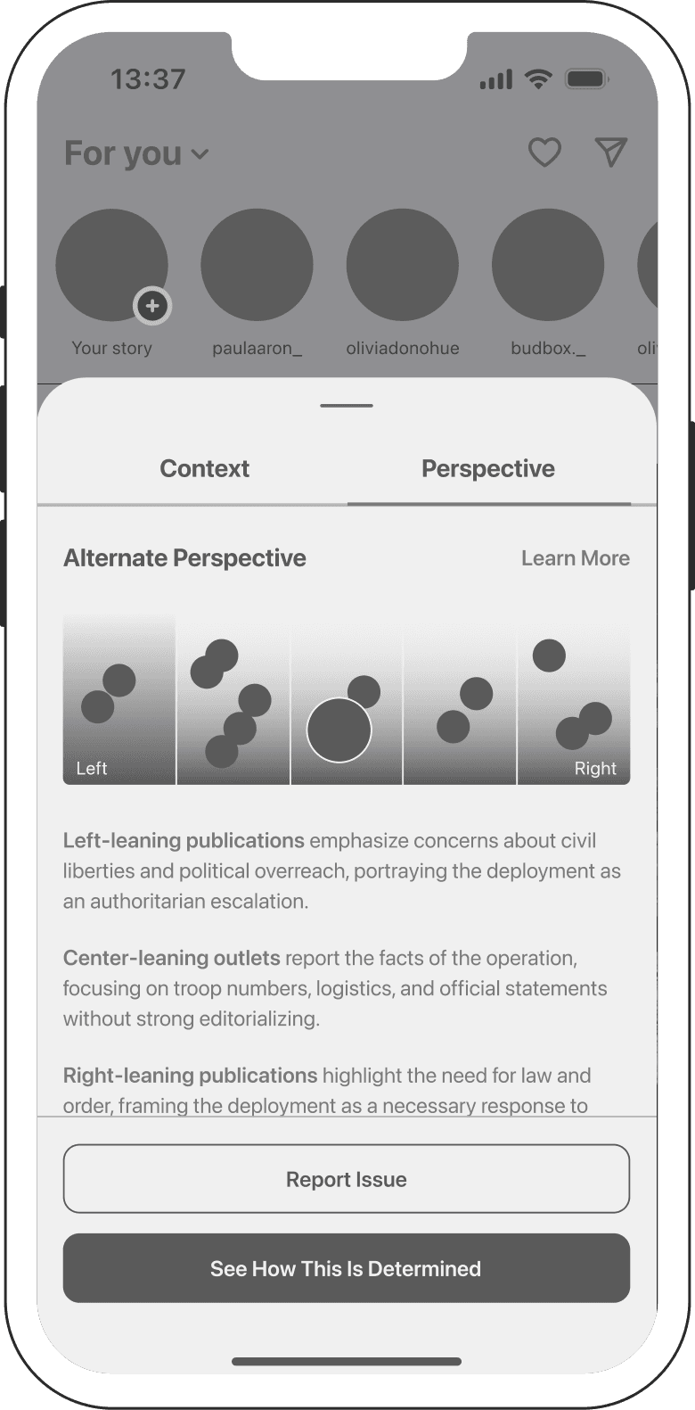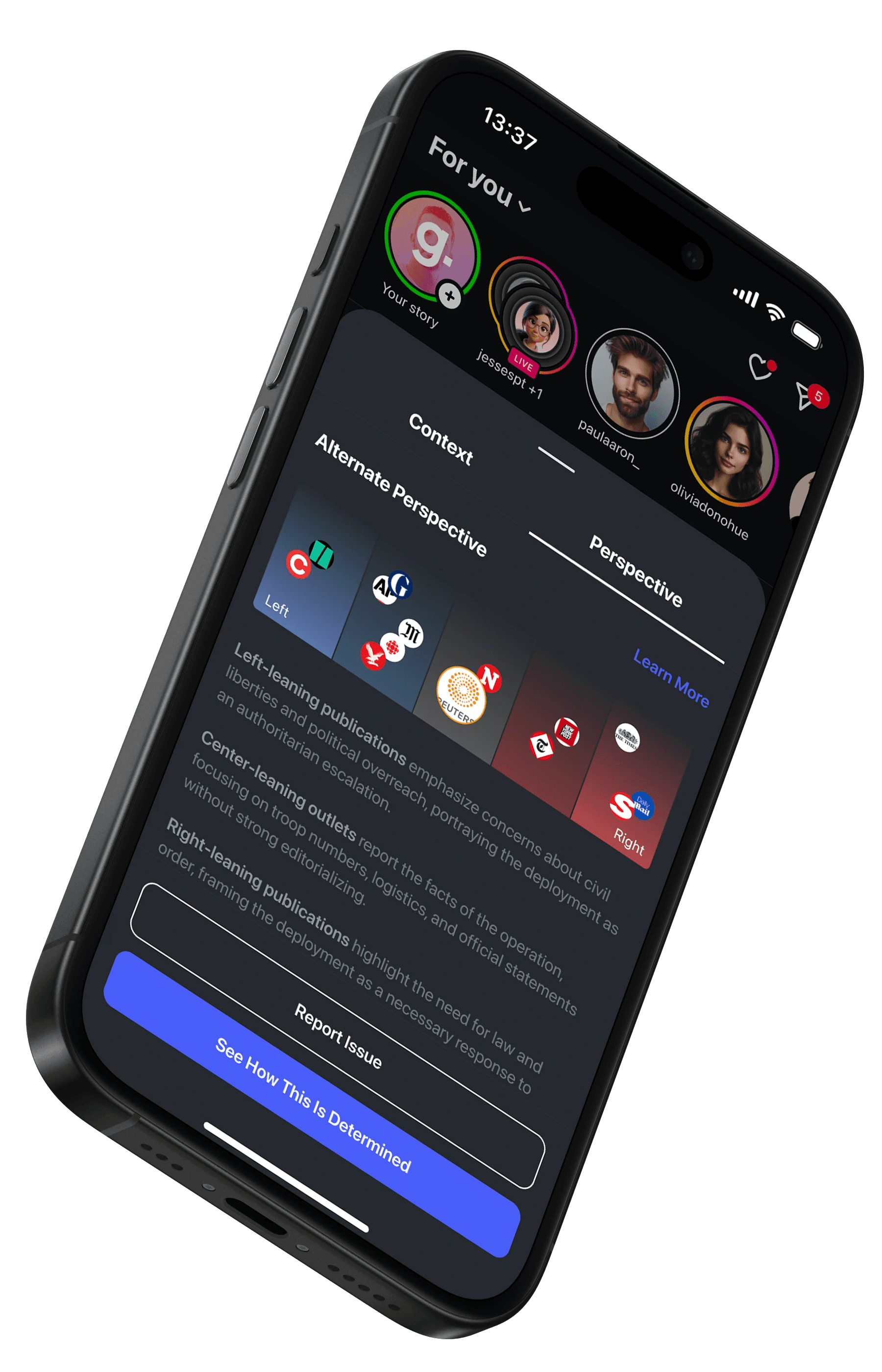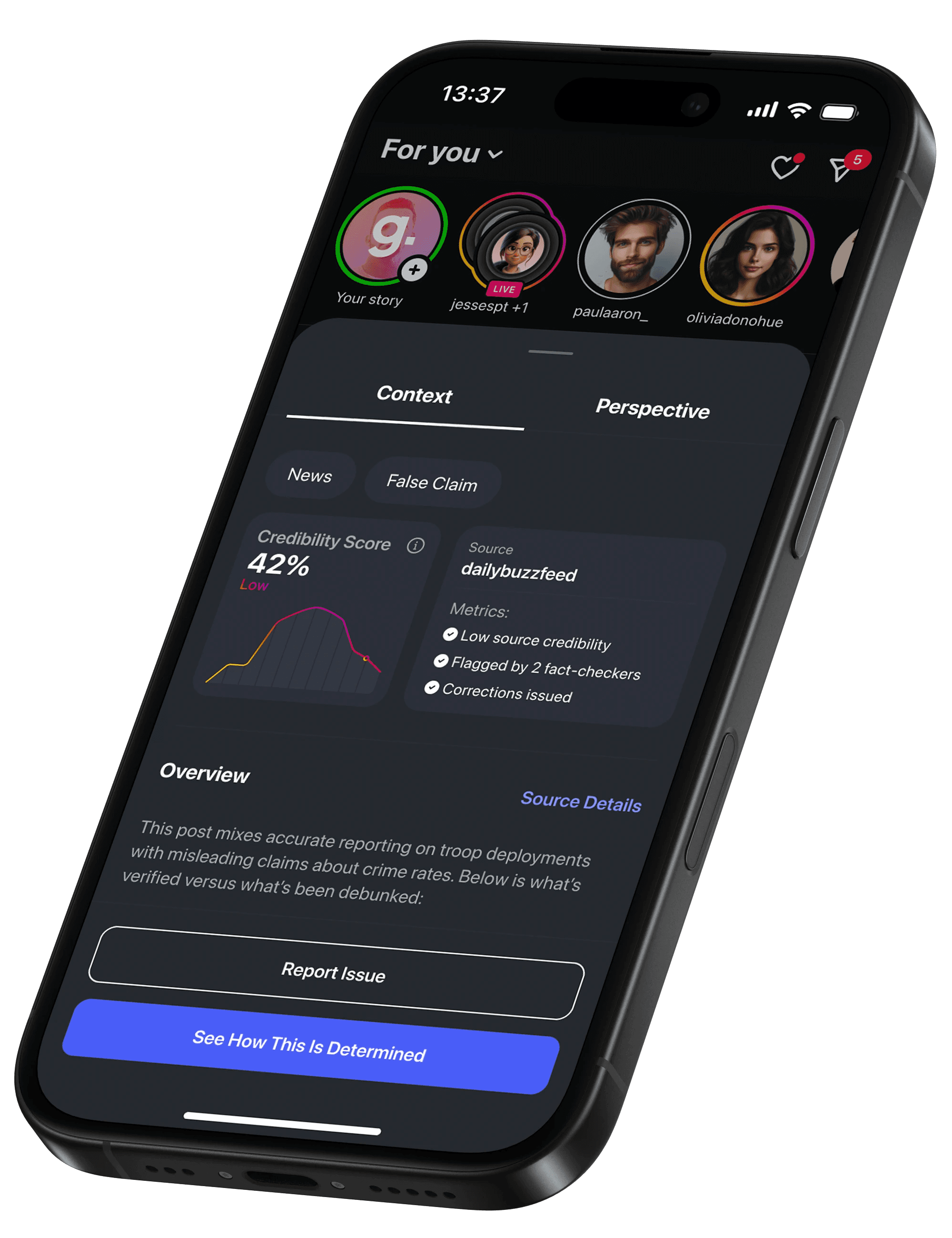 Context without breaking the scroll. When a post might trigger emotional reactions or spread quickly, users can tap for a deeper layer — showing timelines, key facts, and multiple viewpoints.