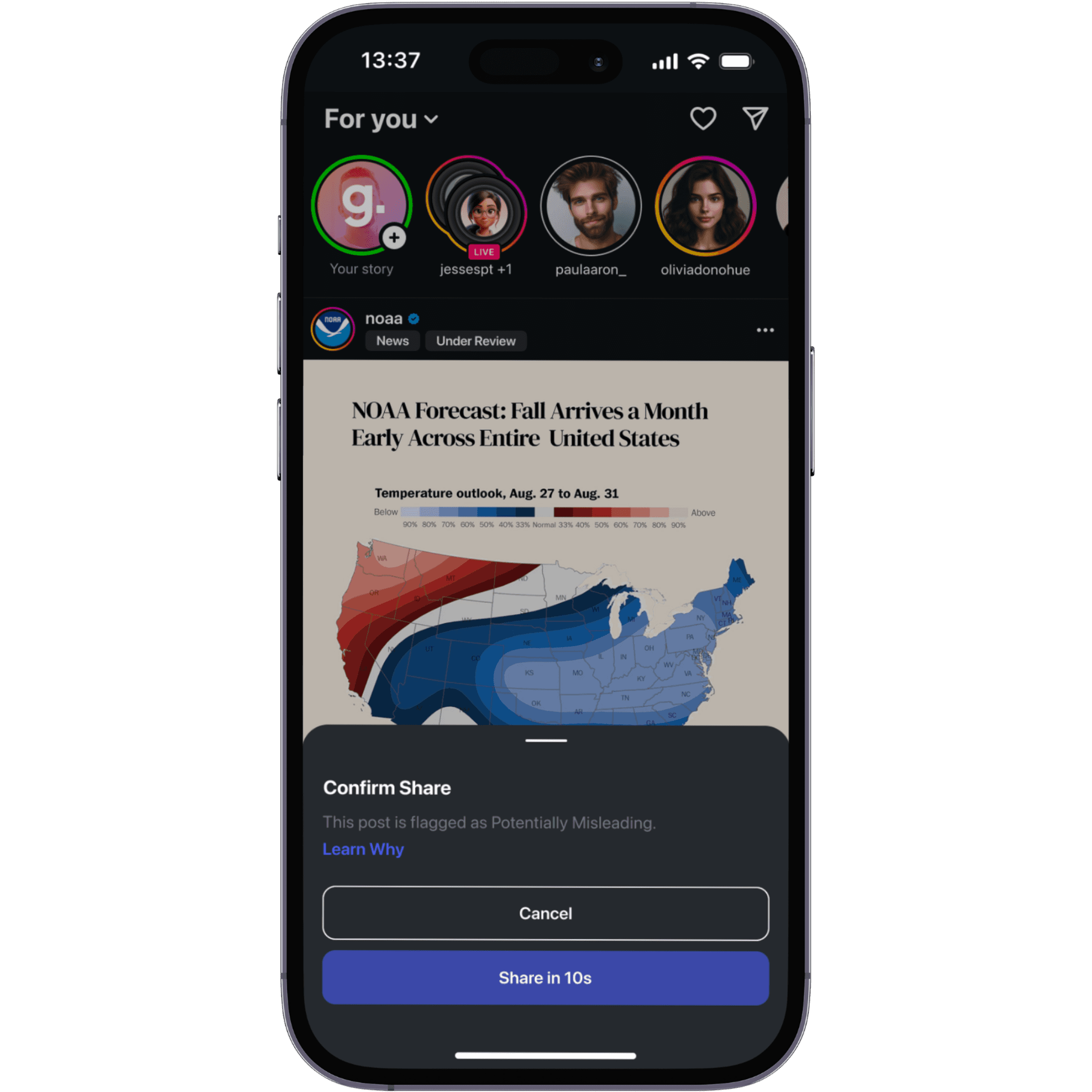 A subtle “before you share” nudge when content is flagged or disputed — lightweight, respectful, and fully skippable, but enough to slow impulsive sharing.