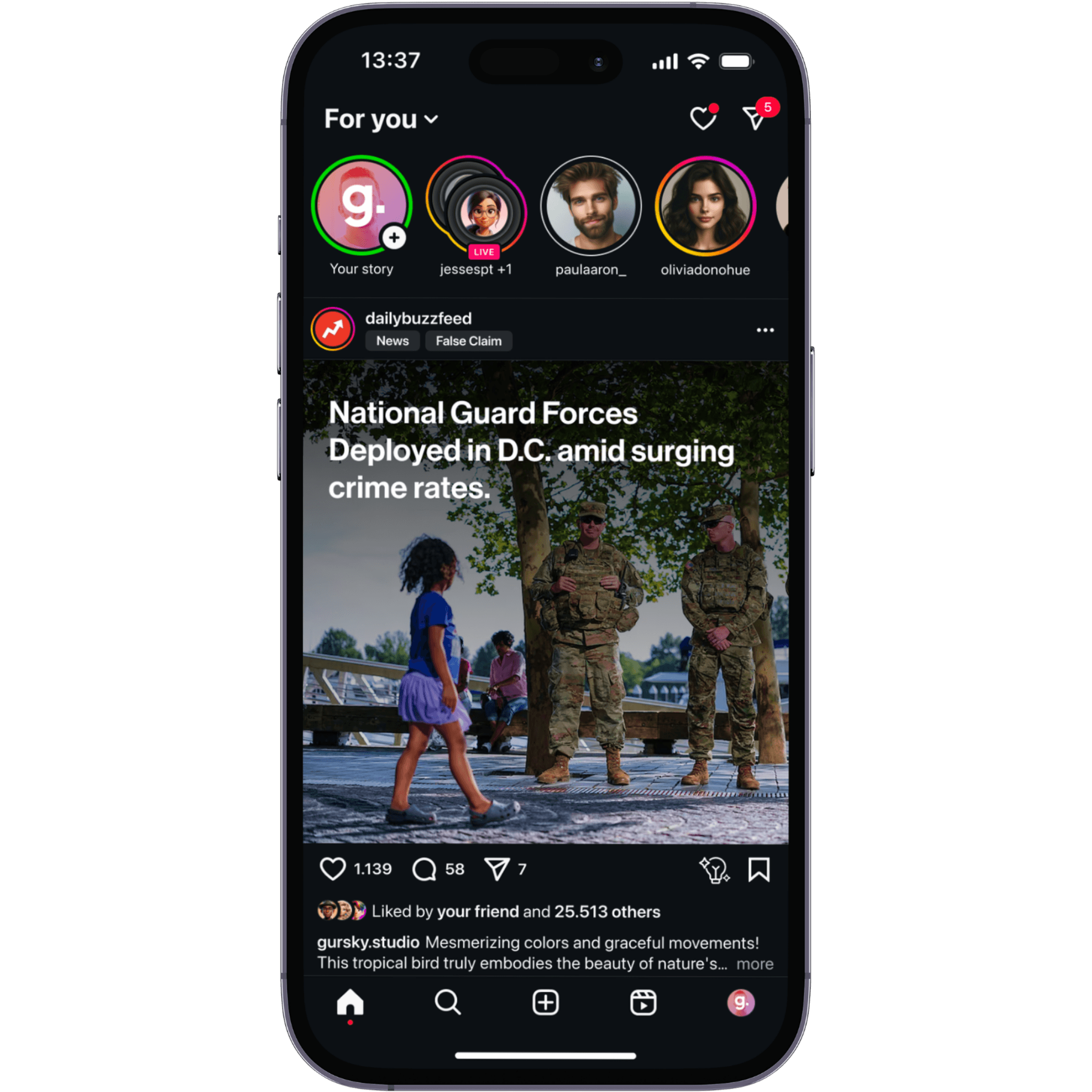 A multi-layer label system that reveals credibility instantly. Every post shows what it is — news, opinion, satire, sponsored, or AI-generated — plus whether it's verified or disputed. Clarity appears exactly where users look first.